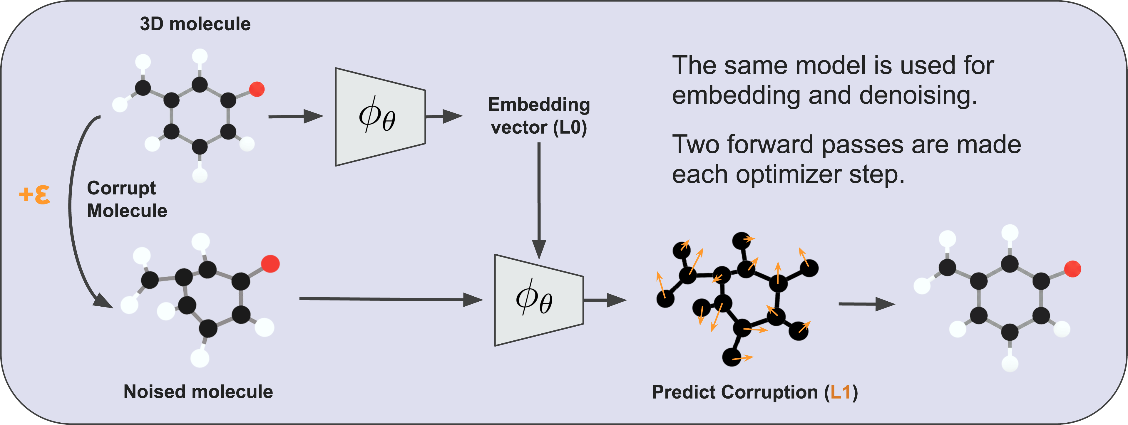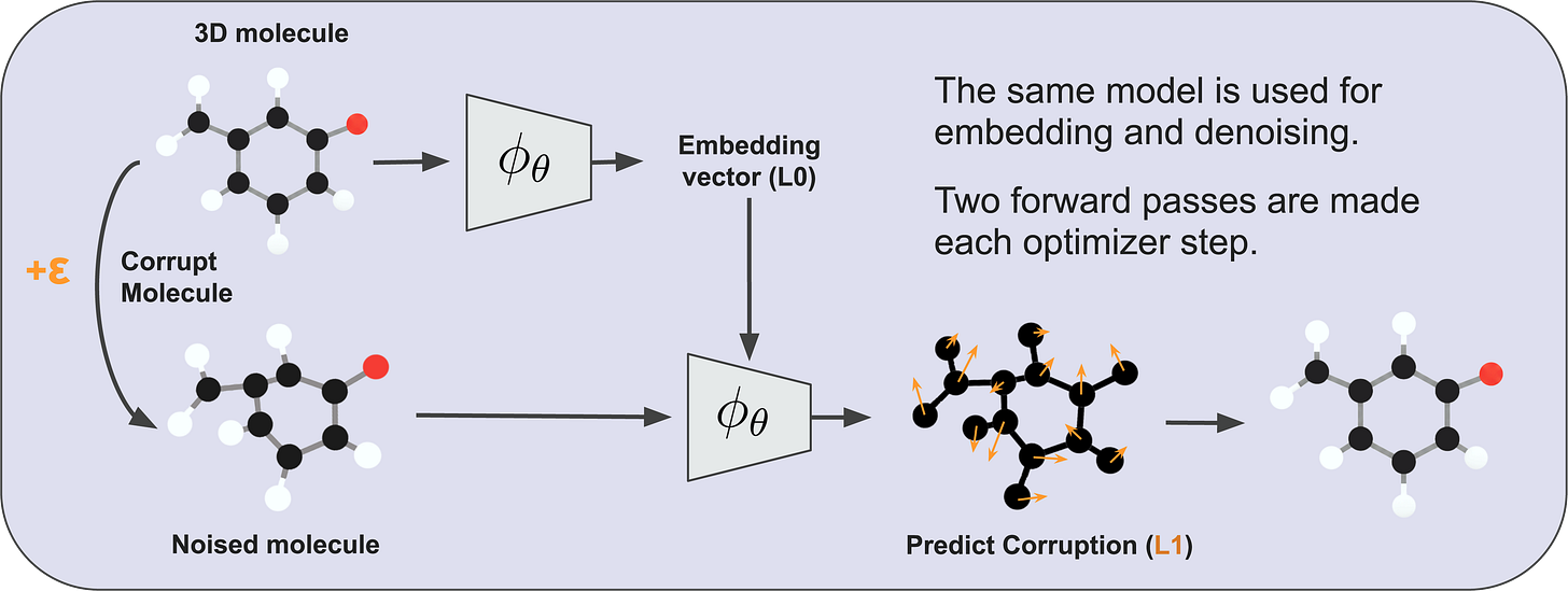As it turns out, deep learning models of 3D atomistic systems benefit considerably from a latent prediction pretraining objective commonly used with joint-embedding predictive architectures (JEPAs), where the model is structurally encouraged to learn embeddings of clean atomic data that, when condensed into global molecular representations, serve as useful context for denoising noisy atomic data. This pretraining setup pushes deep learning models to pick up on local and global semantics of geometric atomic data, where local corruptions of atomic coordinates may change the global features of a molecule (and vice versa). If you are curious to learn more about this approach, its source code is openly available.